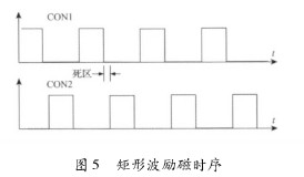 該電路主要由勵磁時序發(fā)生單元、三態(tài)緩沖器及隔離光耦組成。勵磁時序由冷凍鹽水流量計系統(tǒng)的控制核心產(chǎn)生。采用DSP的EPWM外設模塊,通過設定其內(nèi)部定時器的工作模式發(fā)出所要求的勵磁頻率的勵磁時序PWM信號CT_1和CT_2。由于勵磁控制系統(tǒng)中的勵磁工作電源的電壓要比DSP的工作電源電壓高得多,為防止勵磁電路故障對系統(tǒng)控制核心產(chǎn)生致命影響,采用光耦將控制部分與勵磁部分進行隔離。另外,由于DSP引腳的驅(qū)動能力有限,所以在DSP與隔離光耦之間加入三態(tài)緩沖器以驅(qū)動隔離光耦的輸入級。并且,DSP能夠通過GPIO口控制三態(tài)緩沖器上的使能引腳來使能和禁止勵磁,以在檢測到電路故障時迅速關斷H橋所有橋臂。該勵磁時序產(chǎn)生電路通過軟件編程可產(chǎn)生如圖5所示的單頻矩形波。在實際應用中,由于組成H橋的達林頓三極管與MOS管導通與關斷的時間不一致,易在勵磁方向切換瞬間,產(chǎn)生上下橋臂同時導通的現(xiàn)象,反映在勵磁電流波形上為一幅值很高的窄脈沖。該脈沖電流不僅容易引起遲滯比較電路的誤輸出,從而導致高低壓切換電路與電流旁路電路的誤動作,而且對恒流控制電路產(chǎn)生沖擊,減小三端穩(wěn)壓芯片的使用壽命,同時還會產(chǎn)生EMC電磁干擾,給測量精度帶來影響。所以實際應用時,如圖5所示對方波勵磁時序添加死區(qū),可以明顯減小上述現(xiàn)象。