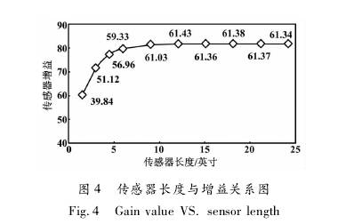 采用一臺(tái)日徑為6英寸、標(biāo)準(zhǔn)線圈的傳感器,改變傳感器長(zhǎng)度,依次進(jìn)行試驗(yàn)室標(biāo)定試驗(yàn)。傳感器長(zhǎng)度與增益的關(guān)系圖如圖4所示。當(dāng)傳感器長(zhǎng)度為9. 1英寸時(shí),其增益為61. 03;但當(dāng)其長(zhǎng)度繼續(xù)增加時(shí),增益變化較小;當(dāng)其長(zhǎng)度6. 1英寸減小到0時(shí),增益從59. 33開(kāi)始下降。也就是說(shuō),當(dāng)傳感器長(zhǎng)度為6. 1-9. 1英寸時(shí),既有效利用了線圈產(chǎn)生的磁場(chǎng),又可使傳感器長(zhǎng)度較短。