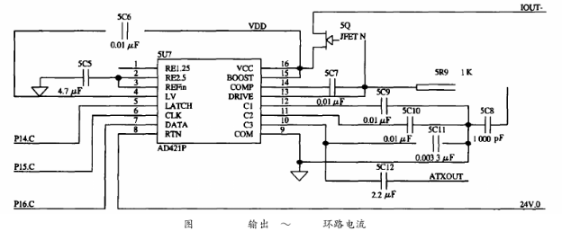 HT2012需要外部提供460.8kHz的時(shí)鐘信號(hào),且要求時(shí)鐘頻率的誤差是0.1%,若直接入一個(gè)460.8kHz的晶振不僅會(huì)引起系統(tǒng)功耗的增加,而且該晶振屬于非標(biāo)準(zhǔn)晶振,需專門定制。為了解決這一問(wèn)題,在系統(tǒng)中采用一片1.8432MHz的晶振以產(chǎn)生時(shí)鐘信號(hào),再經(jīng)分頻器CD4013進(jìn)行4分頗,可輸出1.8432MHz/4=460.8kHz的分頻信號(hào)供HT2012使用。AD421其內(nèi)部的電壓調(diào)節(jié)器與外部的場(chǎng)效應(yīng)管DN25D對(duì)輸入到AD421的電壓進(jìn)行調(diào)整,可提供+3.3V電壓作為其他設(shè)備的電源。HART發(fā)出的FSK信號(hào),經(jīng)過(guò)一個(gè)電容耦合送到AD421中,轉(zhuǎn)換成相應(yīng)的0.5mA正弦電流信號(hào),實(shí)現(xiàn)電壓信號(hào)到電流信號(hào)的轉(zhuǎn)換,同時(shí),疊加在4~20mA的電流上送給接收設(shè)備,實(shí)現(xiàn)了HART協(xié)議的信息的交換。本電路耦合電容取為0.0033μF,如圖5所示。