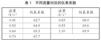 純凈水流量計中流速對儀表系數有著很大的影響,這部分誤差會極大影響*終計量的精確度,傳統的做法是當流速發生較大的持續變化時,需對純凈水流量計進行重新標定。針對這個問題,在不同流速下,測量了純凈水流量計的儀表系數(見表1)。