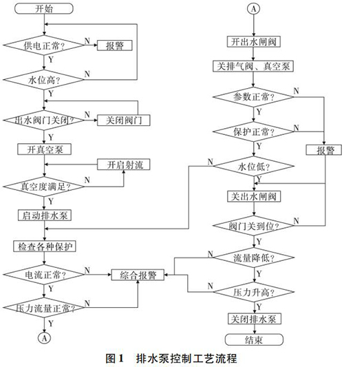 排水泵進行自動化控制模式后,當水倉水位達到開泵要求,PLC 自動檢測電動閥門、球閥、供電電壓等是否正常后,啟動真空泵進行抽真空,當水泵真空度符合開泵要求時便啟動排水泵。排水泵正常運轉后 PLC 時時收集運行數據進行比對,當發現運行數據比對出現差異時影響到排水泵正常運轉時,會發出停泵命令。排水泵控制工藝流程如圖 1 所示。