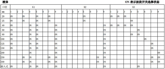 以上表值僅供參考,實際使用中因液體粘度和氣體密度不同應在此值附近調整,頻率低時可將 K3 向大口徑方向調一至三檔。頻率高時可將 K2 向小口徑方向調一至三檔。